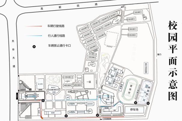 3.在西门行至综合楼右转处设置禁止直行卡口;在综合楼与1、2号教学楼路口设置禁止通行卡口;在1、2号教学楼与艺术、汽车学院办公楼路口设置禁止通行卡口;在体育场与体育馆间靠近停车场的路口设置禁止通行卡口;在体育馆与东围墙路口设置禁止通行卡口。