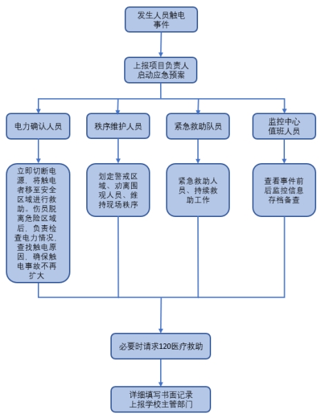 4. 工作流程:当班值班队长在伤员脱离危险区域后,联系校方后勤部门工程人员负责检查电力情况、查找触电原因、修复漏电区域,确保触电事故不再重复发生。