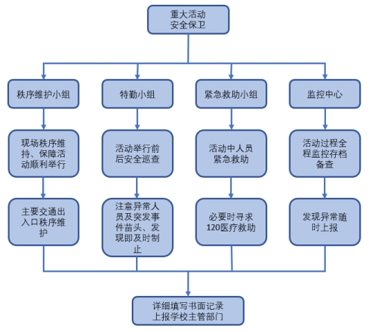 1) 负责全面了解重大活动安排,制定重大活动保卫方案并对重大活动现场进行布控,协调各部门工作以保证会场人员安全。活动后进行总结,并形成报告。