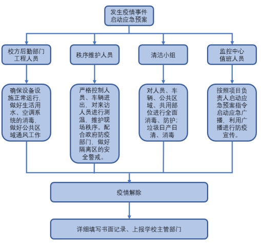 3. 校方后勤部门工程人员取消部分维护性特约服务,重点保证供水、供电、通信、燃气等基础设施的安全运行;做好公共区域及办公区的通风换气工作;如需入户维修,须戴好口罩,使用消毒好的工具,工具使用后再次进行消毒。